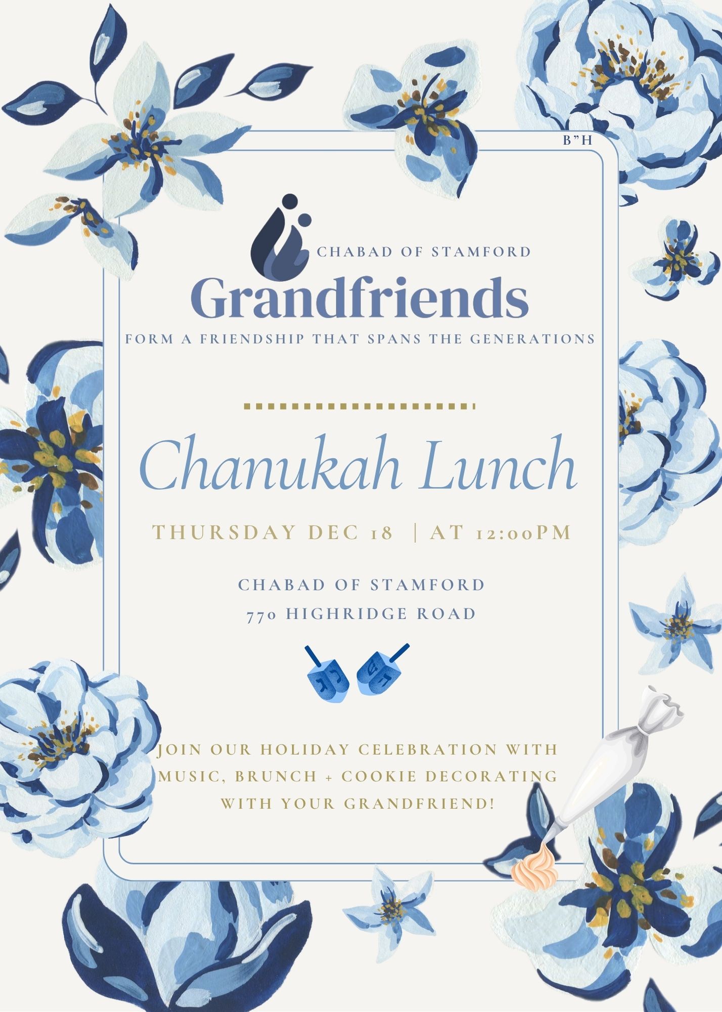Imagine a world where young and old meet and taste the richness of life that knows no age limits. Welcome to Chabad of Stamford’s newest initiative: “Grandfriends”. This initiative will feature intergenerational events with our youngest, oldest and everyone in between! Creating magical friendships through carefully planned activities and creative interactions, paving the way for a caring and connected community. ENROLL TODAY TO BECOME A GRANDFRIEND! For more information, check out our website for a volunteer application or contact programs@stamfordchabad.org.