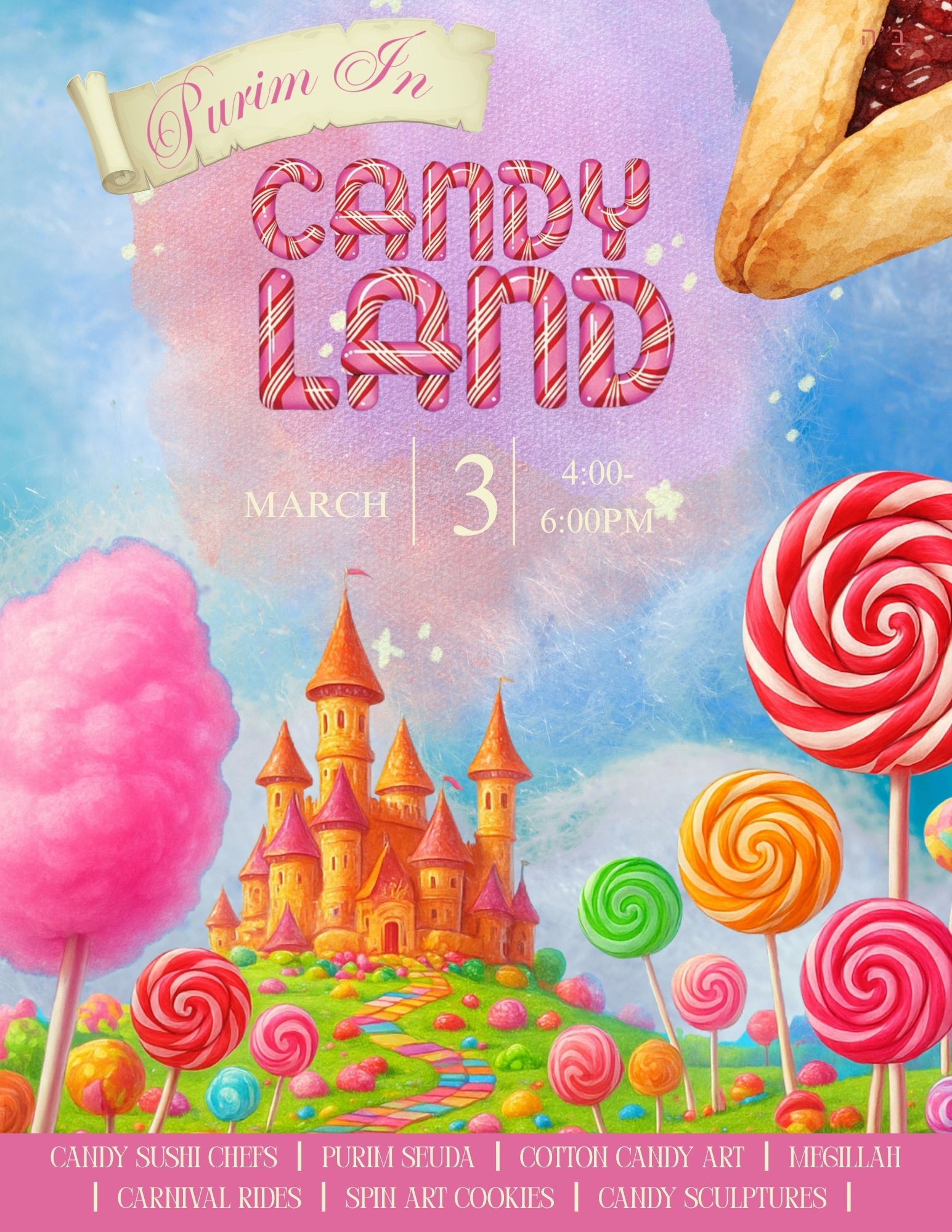 • CANDY SUSHI CHEFS • PURIM SEUDA • COTTON CANDY ART • MEGILLAH • CARNIVAL RIDES • SPIN ART COOKIES • CANDY SCULPTURES • + FULL Chabad Purim Energy!