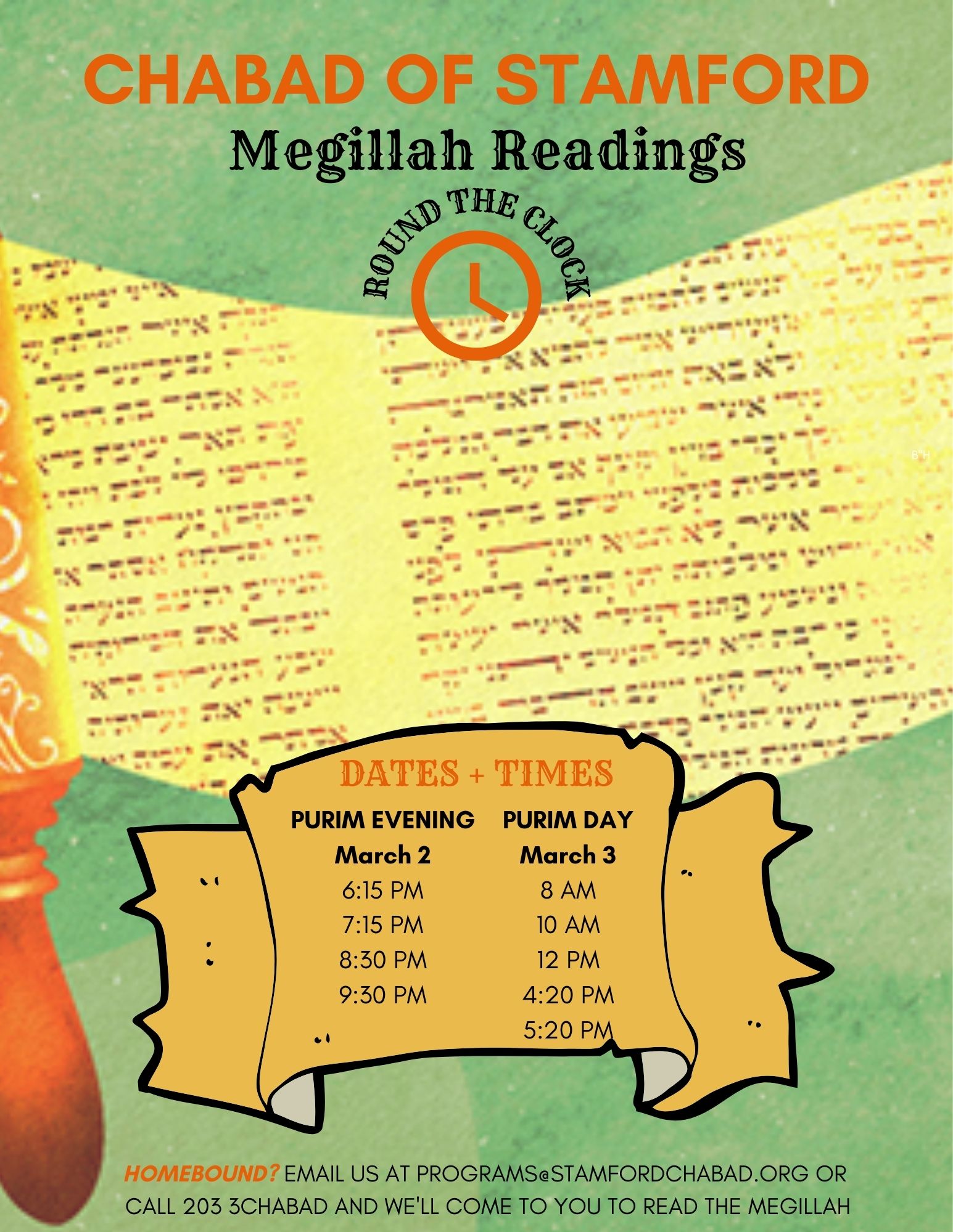 Megillah readings happening round the clock at Chabad! And if you're homebound, just email us at programs@stamfordchabad.org so we can send someone over to read Megillah to you!