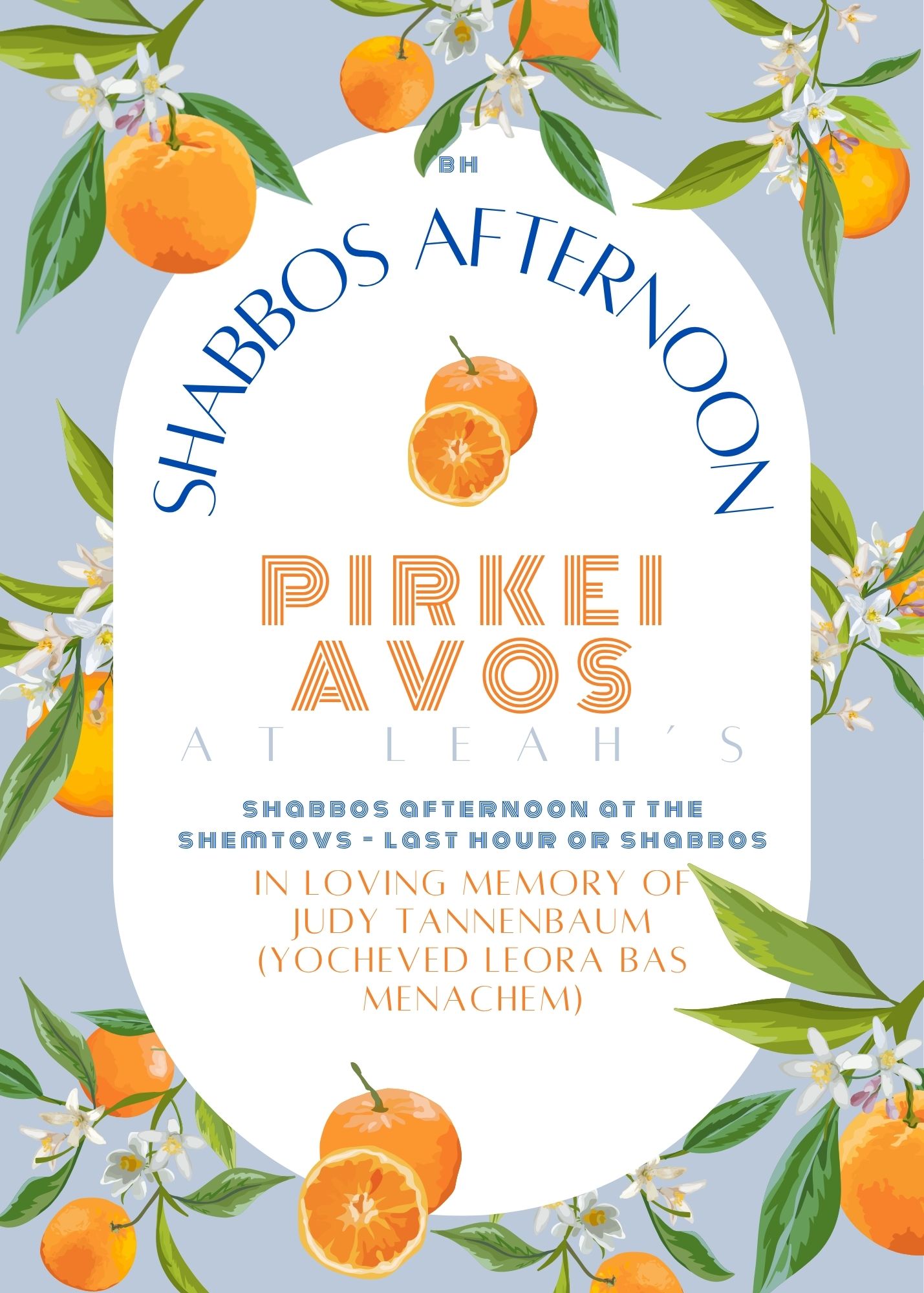 We’re excited to restart Pirkei Avos with Leah on Shabbos afternoons, one hour before Shabbos ends at the Shemtovs. Pirkei Avos, a collection of timeless Jewish ethical teachings, will be learned in loving memory of Judy Tannenbaum, (Yocheved Leora bas Menachem).