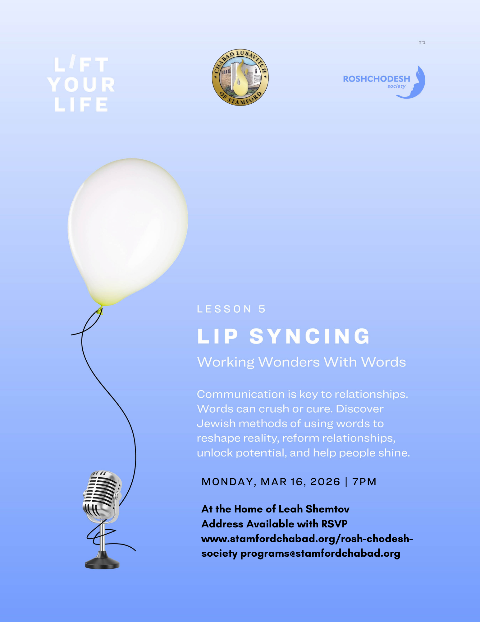 Learn about the Jewish art of communication. Together, we'll discuss how to use speech not as fillers, but as fuel; not as chatter, but as a channel for light