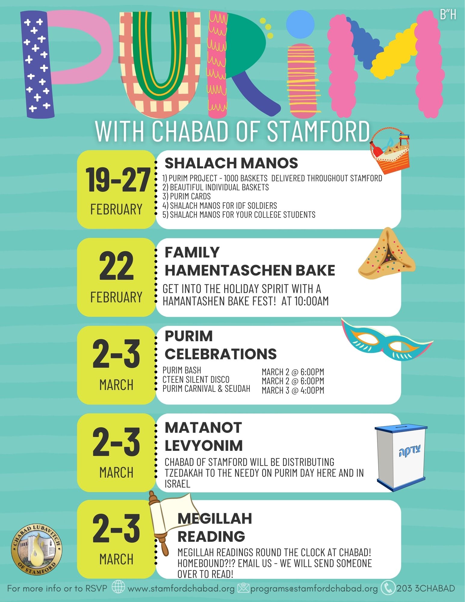 It is a special Mitzvah to give gifts of food to friends, traditionally known as Mishloach Manot or Shalach Manos. For the 23nd year, Chabad of Stamford and Gan Yeladim will be sharing our Shalach Manos Purim Project with the community.